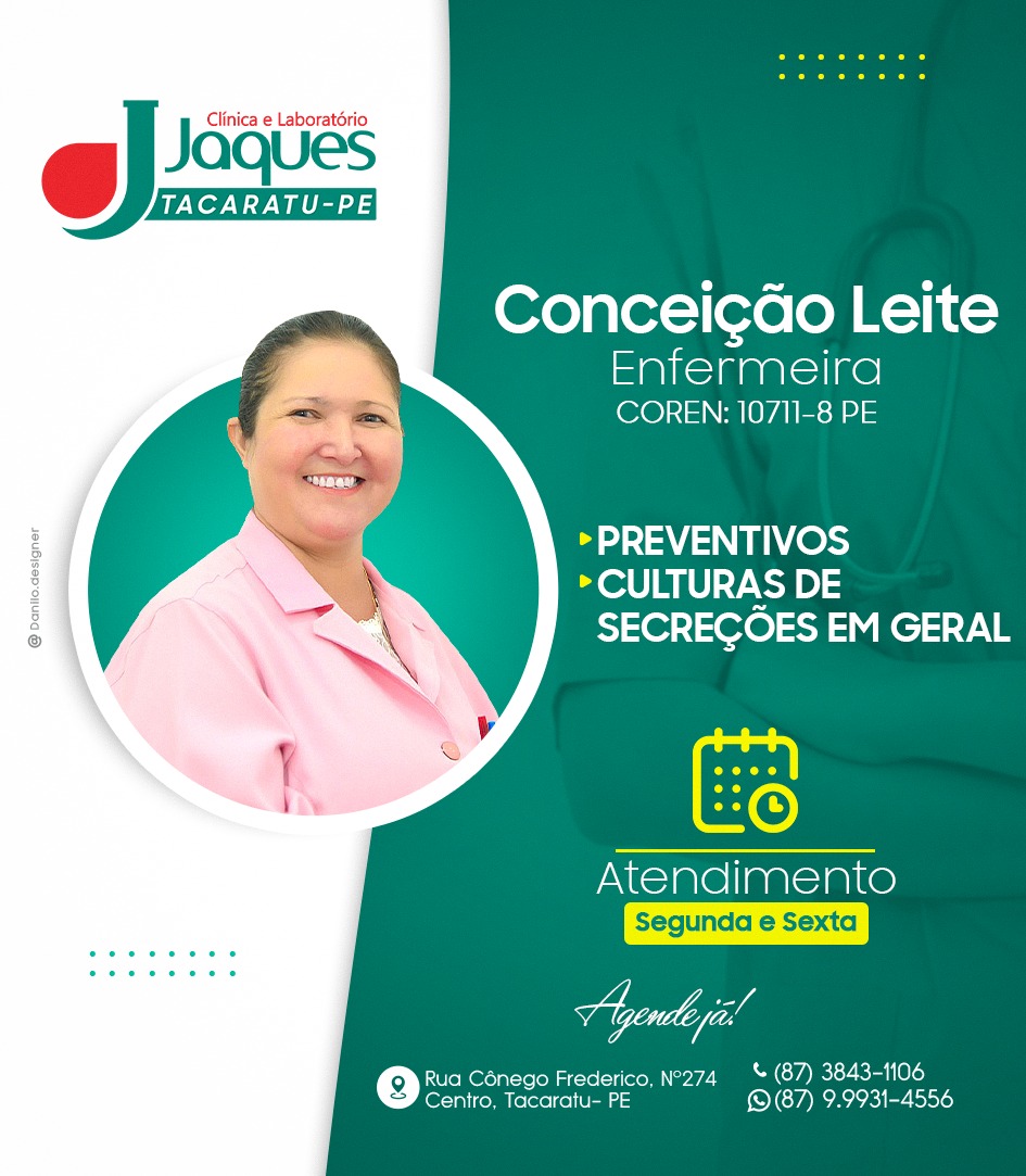 Preventivos e Culturas de Secreções em Geral é com a Enfermeira Conceição Leite, nesta sexta (26), a partir das 12h na Clínica e Laboratório JAQUES de Tacaratu; agende já sua avaliação!