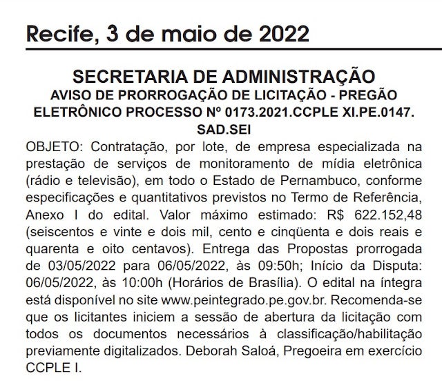 O edital da licitação foi publicado no Diário Oficial hoje e tem como objeto a “contratação, por lote, de empresa especializada na prestação de serviços de monitoramento de mídia eletrônica (rádio e televisão), em todo o Estado de Pernambuco”.