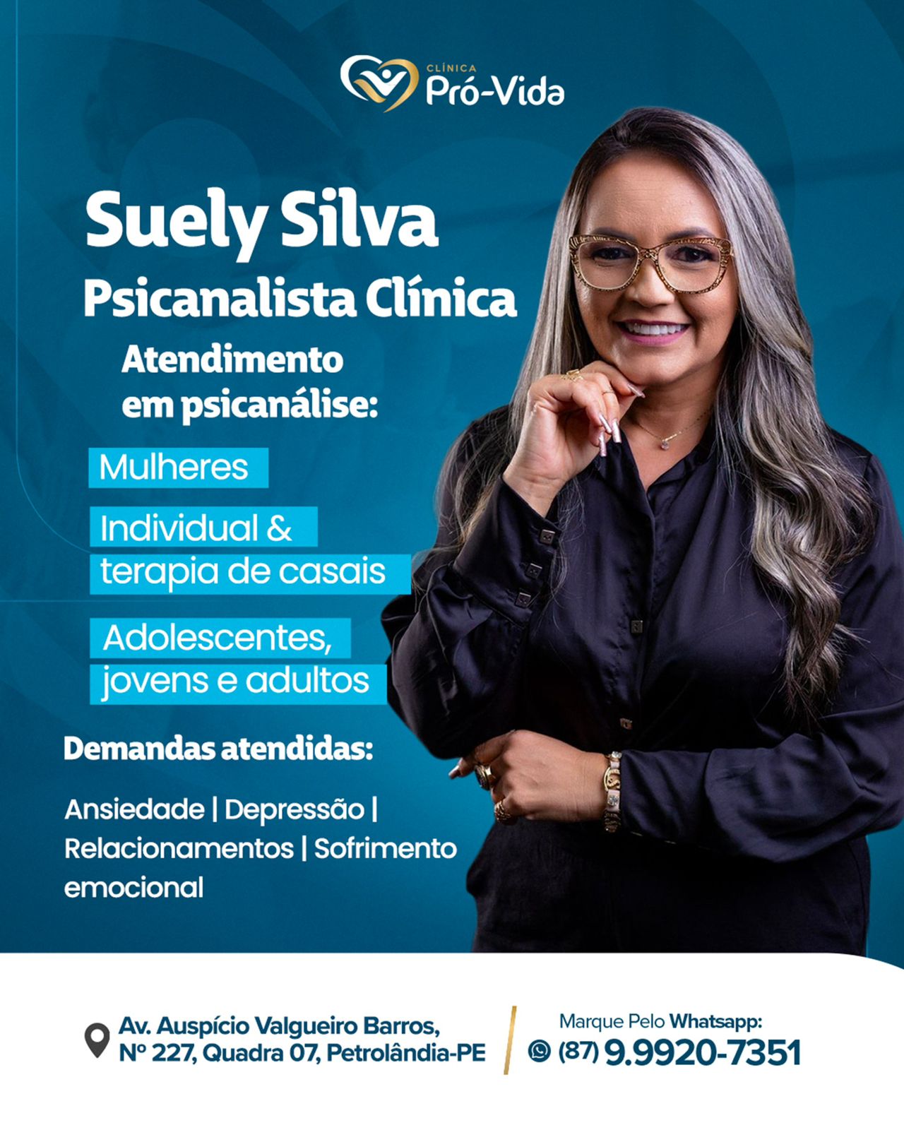 A psicanalista clínica Suely Silva está atendendo na Clínica Pró-Vida, em Petrolândia, oferecendo acompanhamento em psicanálise voltado para mulheres, atendimentos individuais, terapia de casais e acompanhamento de adolescentes, jovens e adultos.