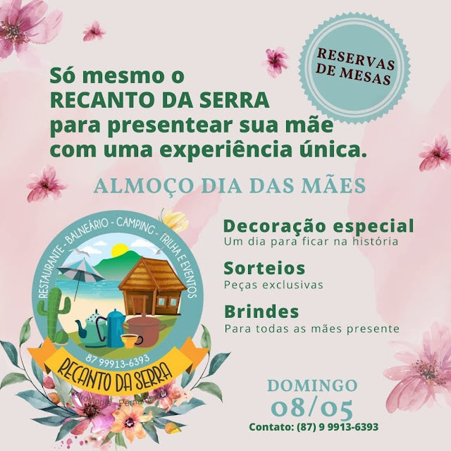 Recanto da Serra, seu ponto turístico em Petrolândia, fará um Almoço Especial para o Dia das Mães, neste próximo domingo (8/5); sorteios de peças exclusivas e entrega de brindes para todas as mães