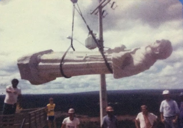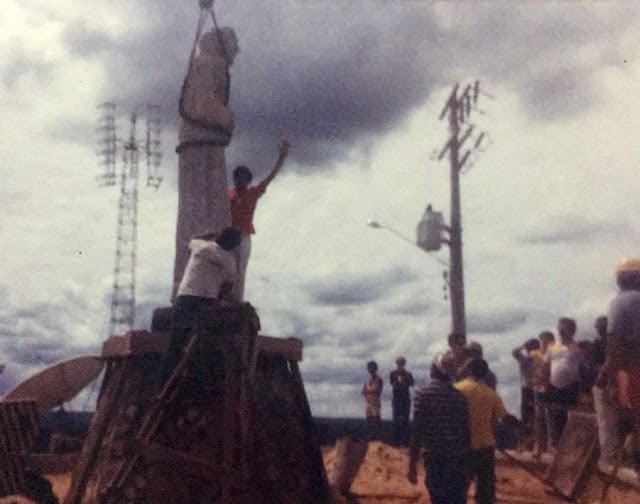 Nesta foto é possível ver Dr. Simões de camisa vermelha em cima da base coordenando a posição que a estátua iria ser instalada/Foto: Divulgação
