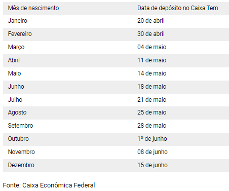 No próximo sábado (14), será a vez dos nascidos em maio. Ainda neste mês, os aniversariantes de junho e julho recebem nos dias 18 e 21 de maio, respectivamente. Nascidos em agosto e setembro, são os dois últimos grupos a receber em maio, nos dias 21 e 28. O calendário – que você vê completo abaixo – seguirá o mês de nascimento do trabalhador e vai até 15 de junho.