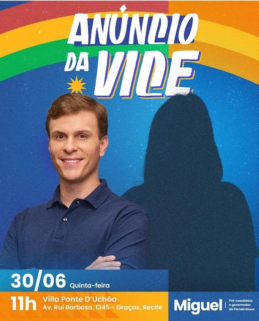 O pré-candidato ao governo de Pernambuco pelo União Brasil, Miguel Coelho, vai anunciar na próxima quinta-feira (30) durante LIVE no seu Instagram a partir das 11h, o nome da pré-candidata a vice-governadora na chapa encabeçada pelo partido. A confirmação veio em postagem na manhã de hoje (28). O evento será na Villa Ponte D’ Uchôa na Avenida Rui Barbosa, N° 1345, Graças no Recife.