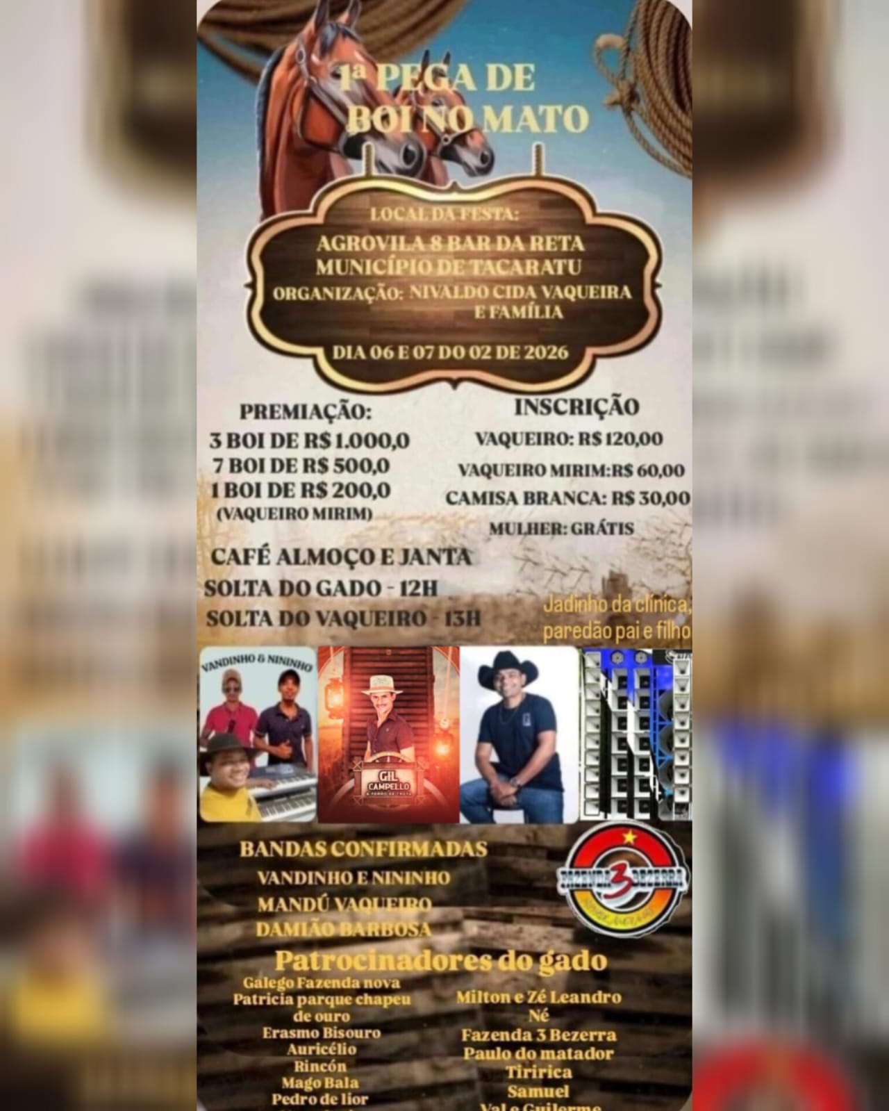 A 1ª Pega de Boi no Mato de Tacaratu chega para fortalecer a cultura vaqueira, valorizar os homens e mulheres do campo e se consolidar no calendário festivo da região.