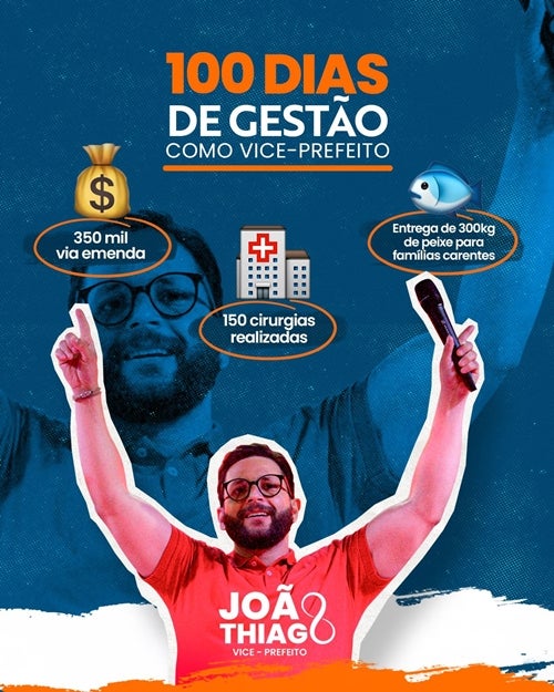 Entre as principais conquistas, João Thiago anunciou a articulação e conquista de *R$ 350 mil em emenda parlamentar, que serão destinados a melhorias para o município. Além disso, o vice esteve diretamente envolvido na viabilização de *150 cirurgias realizadas para moradores da cidade e na distribuição de 300 kg de peixe a famílias carentes que será realizada durante o período da Semana Santa.